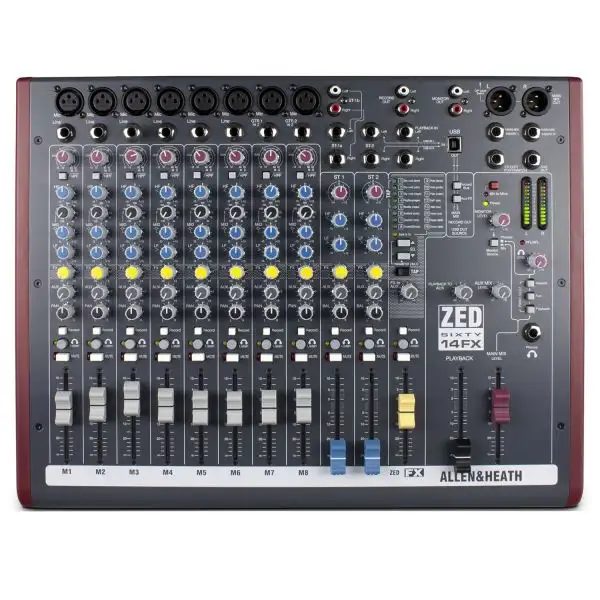 βLive or in the studio, the Allen & Heath ZED60-14FX is a compact, portable mixer that is ideal for small bands. This mixer is a guitaristβs dream. Two of the 8 mono channels have high impedance jack inputs that can take a normal line level or a low level input from a guitar pickup, so guitars can be plugged straight into the mixer without the need for DI boxes. These inputs have been crafted to recreate the sound of a classic tube preamp in a combo or head amp for incredible definition and warmth. Two stereo inputs are provided for MP3/CD players or keyboards. ZED60-14FX comes with configurable USB audio in/out, making it easy to capture a stereo recording at the gig or in the studio. The mixer is equipped with professional XLR main stereo outputs, a flexible monitoring section with headphone and speaker feed outputs, and 16 stunning FX. Most important of all, ZED60-14FX lives up to the audio and build quality standards that have made Allen & Heath one of the most trusted names in professional audio for more than 40 years.