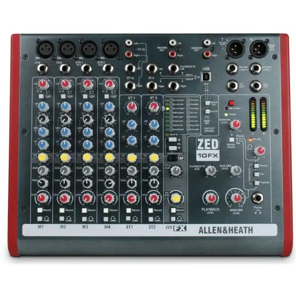 The Allen & Heath ZED-10FX is an amazing little desk for small band mixing. It is ultra portable for carrying to the gig, and can be used for recording live or in the studio. It comes with configurable USB audio in/out making it easy to capture stereo recordings. Guitars can be plugged in directly to the mixer using the specially designed high-impedance inputs, while the mixer has two stereo inputs for MP3/CD players or keyboards. Equipped with professional XLR stereo outputs and a flexible monitoring section with headphone and speaker feed outputs. Weβve added a set of fabulous effects to give shimmering reverbs and enhance your sound.