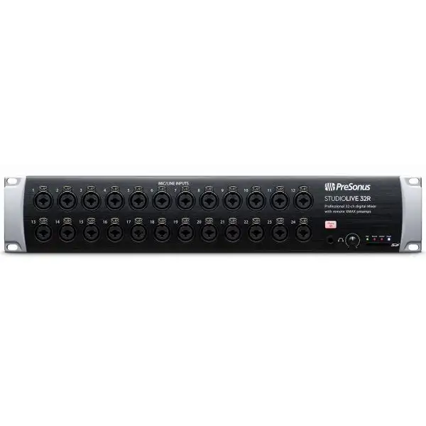 The PreSonus StudioLive 32R 32 Channel Rack Mount Digital Mixer is a perfect partner for your StudioLive Series III console/recorder, serving as either a simple stage box or a combination stage box and monitor mixer. Since Series III rack mixers and consoles can network using AVB, you can connect your StudioLive 32R to a Series III front-of-house console with one lightweight CAT5e or CAT6 Ethernet cable, eliminating the need for a heavy, expensive copper snakeβand the signal degradation that goes with long analog cable runs. You can even remote control the StudioLive 32Rβs preamps and phantom power from your networked Series III console. In stage box + monitor mixer mode, the StudioLive 32R not only serves as an excellent networked stage box, it is a full blown monitor mixer with far more processing and mixing power than any mixer in its classβall packed into just two rackspaces (2U).